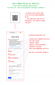 • 방문자 등록을 위한 QR코드를 꼭 등록해주시길 바랍니다. 혹시 안되는 분들께서는 현장에서 직접 하셔야 되겠습니다.