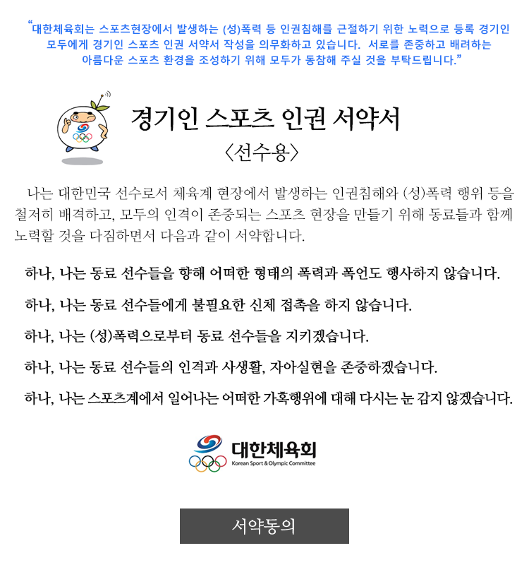 대한체육회는 임시대의원총회에서 의결된 '스포츠폭력 추방을 위한 특별 조치방안' 추진의 일환으로 경기인(선수,지도자,심판) 등록 신청 시 <스포츠인권서약서>에 의무 동의토록 시스템을 개편하고자 합니다.