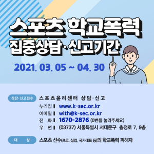 스포츠 학교폭력 집중상담, 신고기간 페이지 정보 작성자 jjakw 댓글 0건 조회 4,373회 작성일 21-03-22 20:12 목록 본문 이전글2021년도 제59회 체육주간 안내 21.04.22 다음글방역관리자 업무 교육 및 안전보건교육시간 인정 알림 21.03.16