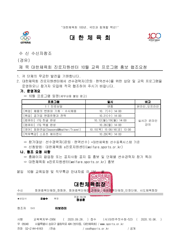 대한체육회 진로지원센터 10월 교육프로그램 페이지 정보 작성자 jjakw 댓글 0건 조회 4,394회 작성일 20-10-14 15:31 목록 본문 대한체육회 진로지원센터 10월 교육일정 안내입니다. 업로드 파일: 대한체육회 진로지원센터 10월 교육 프로그램 홍보 협조요청. pdf 이전글IOC GET SET 부상예방프로그램 20.10.14 다음글스포츠응급처치 메뉴얼 배포 알림 20.09.24