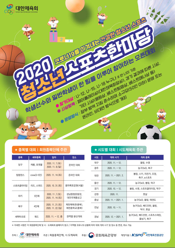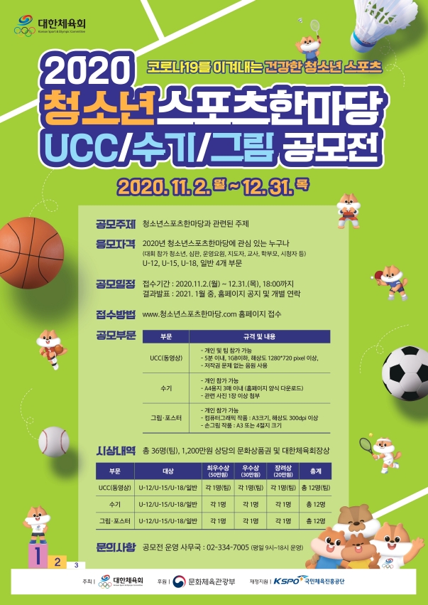 2020 청소년스포츠한마당 공모전(수기_그림_UCC) 개최 안내 및 참가안내 페이지 정보 작성자 jjakw 댓글 0건 조회 4,338회 작성일 20-12-08 11:49 목록 본문 2020 청소년스포츠한마당 공모전(수기_그림_UCC) 개최 안내입니다. 첨부파일 : 2020 청소년스포츠한마당 공모전(수기_그림_UCC) 개최 안내 및 참가 독려 협조 요청 이전글2020년 국제심판 역량강화 온라인 워크숍 20.12.08 다음글대한주짓수회 이사회 진행 20.11.03