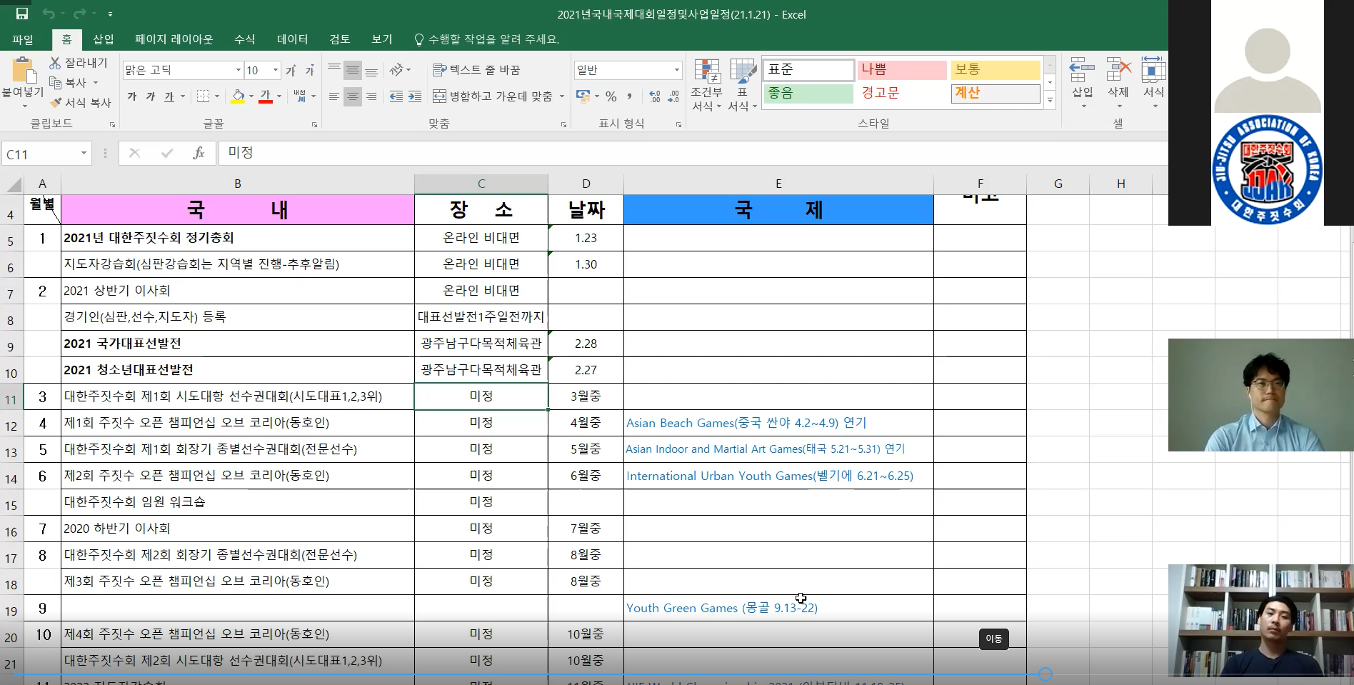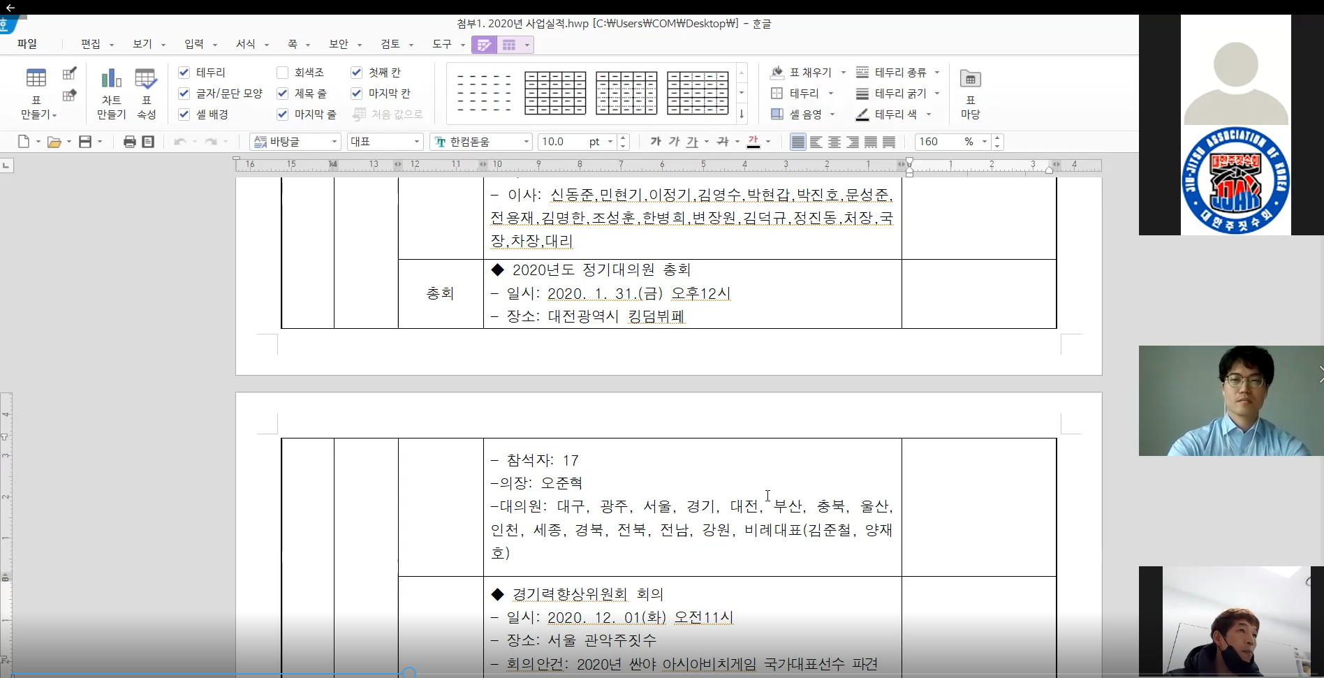 대한주짓수회 정기총회 개최(21.1.23) 페이지 정보 작성자 jjakw 댓글 0건 조회 4,349회 작성일 21-01-26 13:56 목록 본문 1/23 대한주짓수회 정기총회를 온라인 화상채팅으로 진행하였습니다. 참여해주신 회장님, 대의원님 모두 수고많으셨습니다. 이전글방역관리자 업무 교육 및 안전보건교육시간 인정 알림 21.03.16 다음글스포츠인권정책 심포지엄 개최 안내 20.12.08